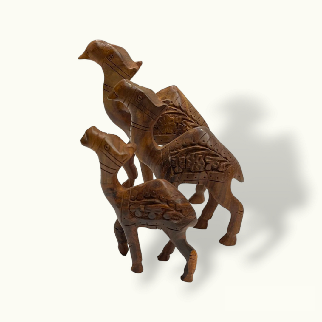 This Carving Wooden Camel Set is crafted from the finest hard wood, making it strong and durable. Each piece is intricately carved for a beautiful, detailed look. With its natural finish, this set will be a stunning addition to any decor. Smooth and Strong Camel Set. Unique Handicraft wooden sculptures. Expertly handcrafted from high-quality wood, this stunning camel statue set will add a touch of elegance to any decor. With intricate detailing and a beautiful design, these camels are the perfect addition to your collection. Each piece is unique and will surely be a conversation starter.